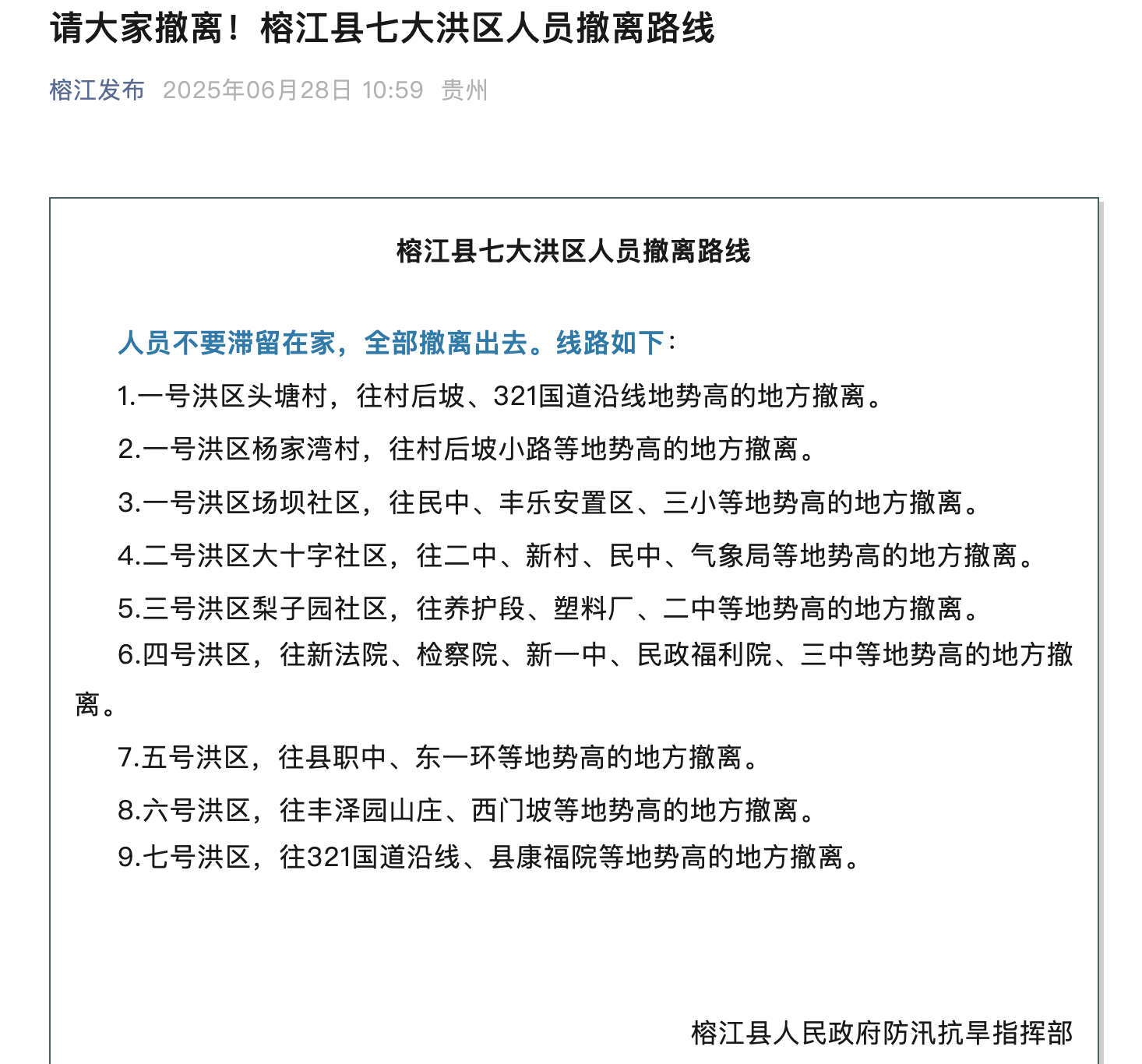 当日上午10时许,榕江县人民政府防汛抗旱指挥部发布紧急通知:人员不要滞留在家,全部撤离出去。
