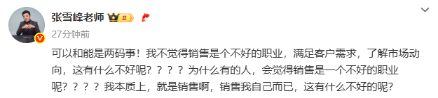28日下午,@张雪峰老师发文回应:“可以和能是两码事!我不觉得销售是个不好的职业,满足客户需求,了解市场动向,这有什么不好呢????为什么有的人,会觉得销售是一个不好的职业呢????我本质上,就是销售啊,销售我自己而已,这有什么不好的呢?”
