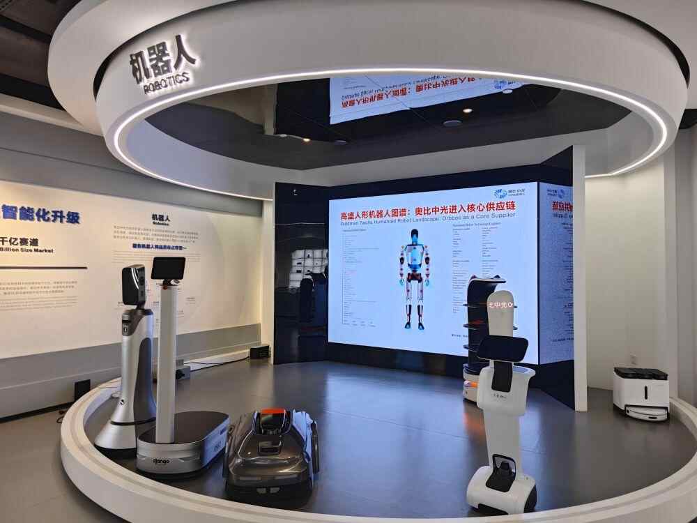 在奥比中光科技集团股份有限公司的展厅里,一个白色的立式送餐机器人在展示区里来回穿梭,迎宾机器人、扫地机器人、割草机器人等产品也陈列其中,“忙碌”的送餐机器人时而绕过它们,时而穿过其间,总能灵巧地避开障碍。