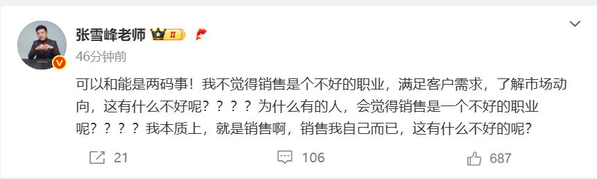 对于此番言论引起的争议,28日下午,张雪峰发文回应称:“可以和能是两回事!我不觉得销售是个不好的职业,满足客户需求,了解市场动向,这有什么不好的呢?为什么有的人,会觉得销售是一个不好的职业呢?我本质上,就是销售啊,销售我自己而已,这有什么不好的呢?”