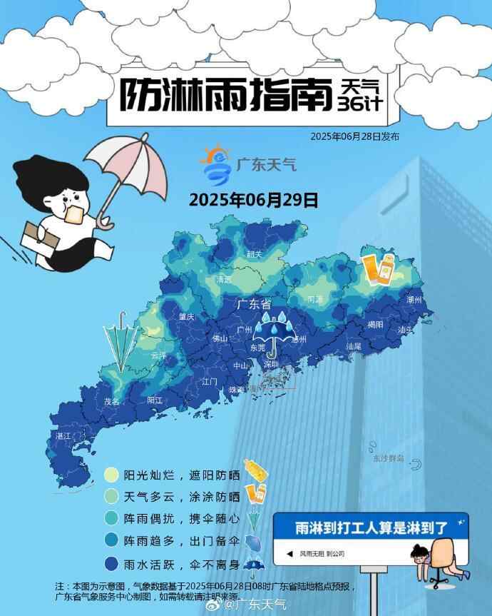 @广东天气预计,6月29日至7月1日,广东处于副高边缘不稳定区域,空气湿度大,加上偏南气流辐合影响,雷雨依旧频繁,局部雨势较大。