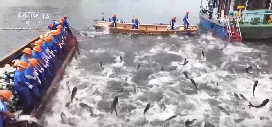 央视网消息:6月21日,浙江杭州淳安千岛湖进行了水上夏收。渔工们下网捕鱼,一网就收获了8万多斤鲢鳙鱼,岸上观看的游客们也一起分享了丰收的喜悦。