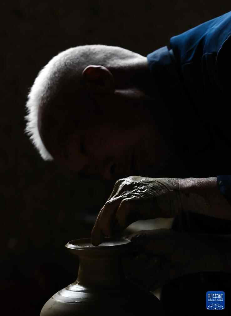 6月17日,制陶师傅邓招财在桂东县普乐镇陶瓷作坊制作陶器。