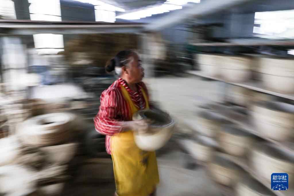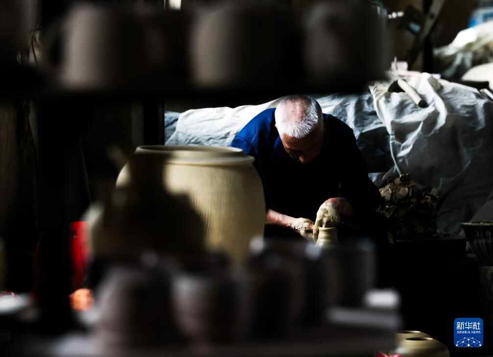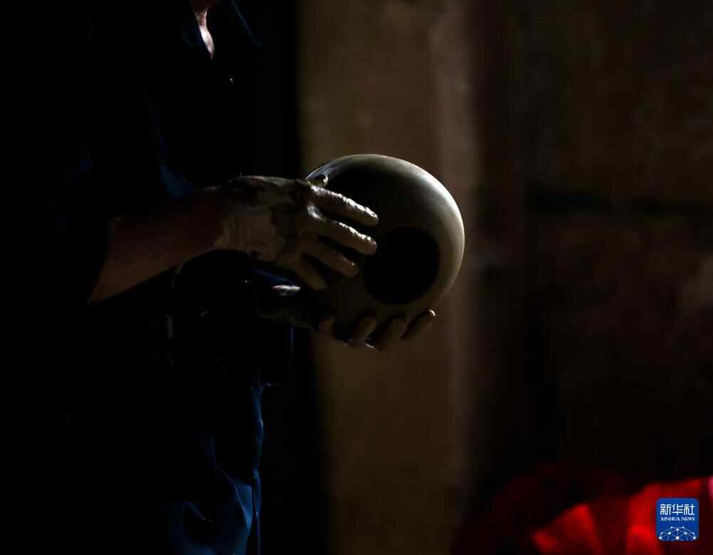 6月17日,制陶师傅方亮生在湖南省郴州市桂东县普乐镇陶瓷作坊制作陶器。