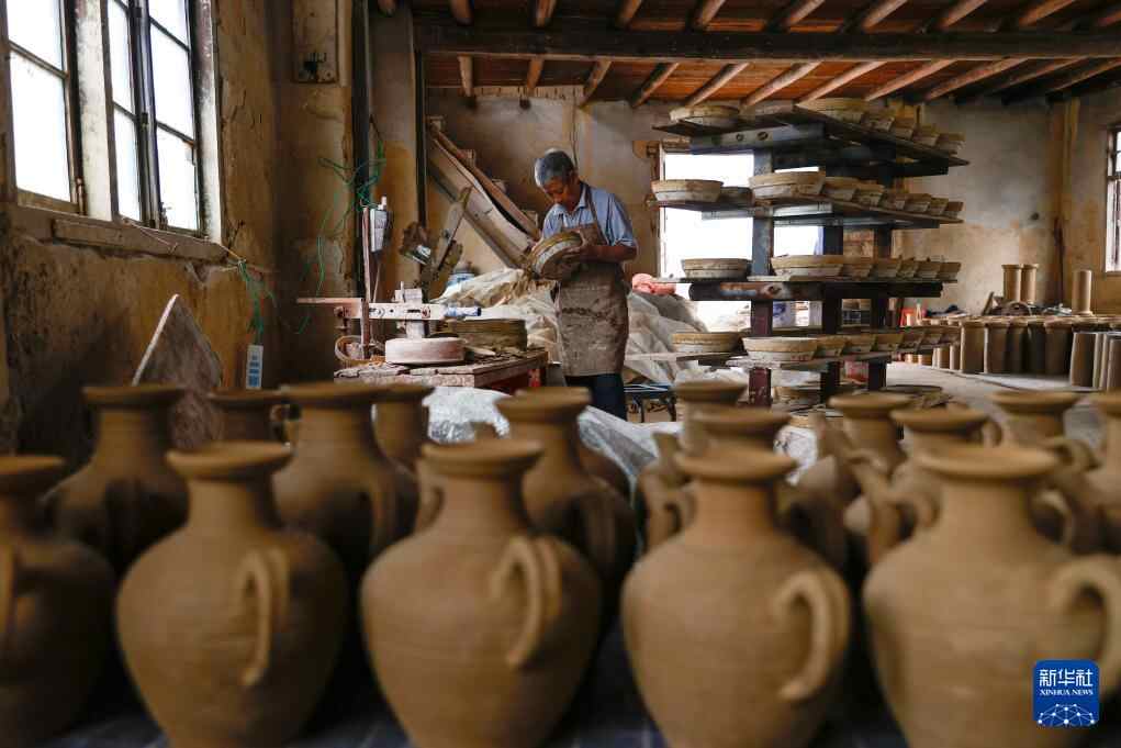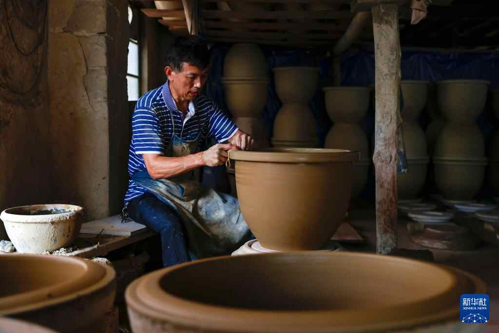 6月17日,制陶师傅在桂东县普乐镇陶瓷作坊制作陶器。