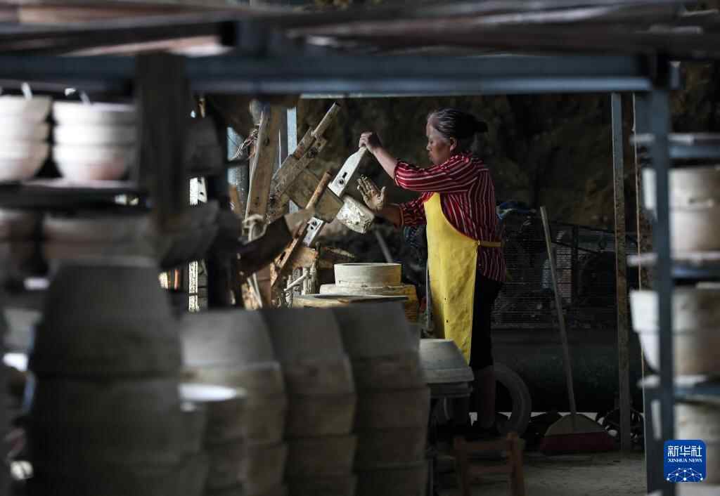 6月17日,制陶师傅邓招财在桂东县普乐镇陶瓷作坊制作陶器。