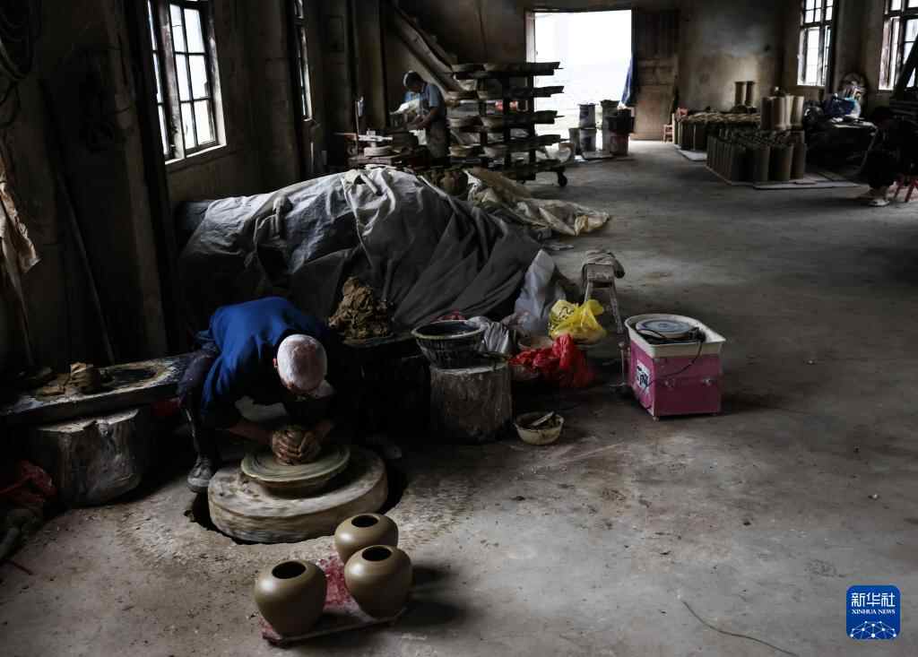 6月17日,制陶师傅方亮生在湖南省郴州市桂东县普乐镇陶瓷作坊制作陶器。