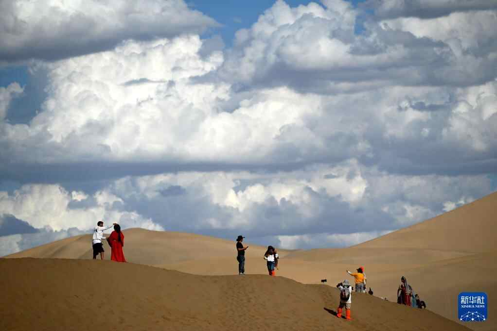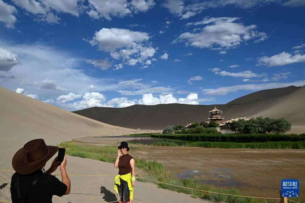 6月21日,游客在甘肃省敦煌市鸣沙山月牙泉景区游览拍照。
