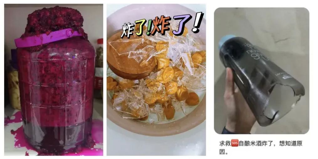 爆炸的原因跟百香果汁爆炸的原理相同,都是因为微生物发酵产生的二氧化碳气体。区别在于酿酒、泡菜是我们主动打造出来一个适合微生物主动繁殖、发酵的环境。如果我们需要在家酿酒、做泡菜,可以选择定期排气或直接使用泡菜坛来研制。