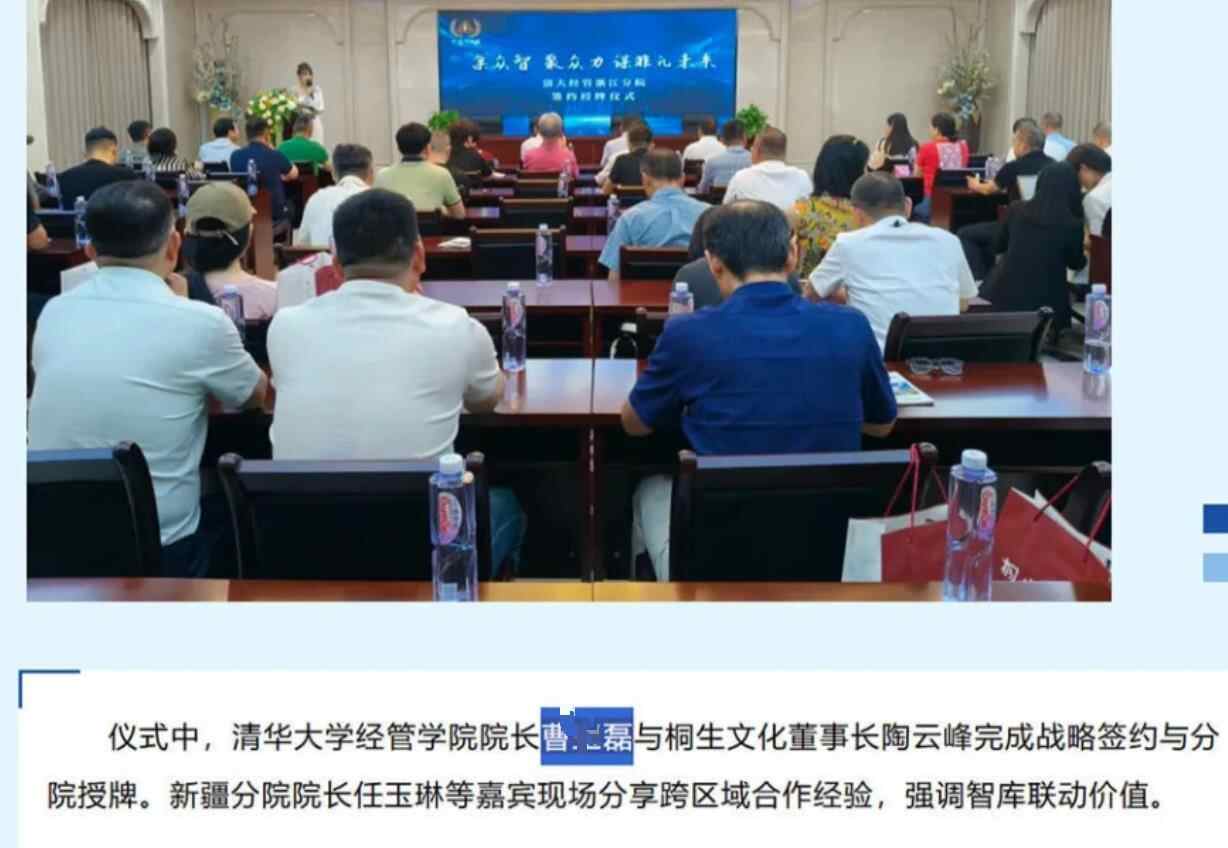 该文章提到,6月22日上午,清华大学经济管理学院浙江分院签约授牌仪式在海宁上川商务有限公司举行。活动聚焦“集众智聚众力谋非凡未来”主题,来自清华大学、企业界的代表齐聚一堂,共同见证这一推动区域经济发展的重要时刻。仪式中,清华大学经管学院院长曹某磊与桐生文化董事长陶某某完成战略签约与分院授牌。
