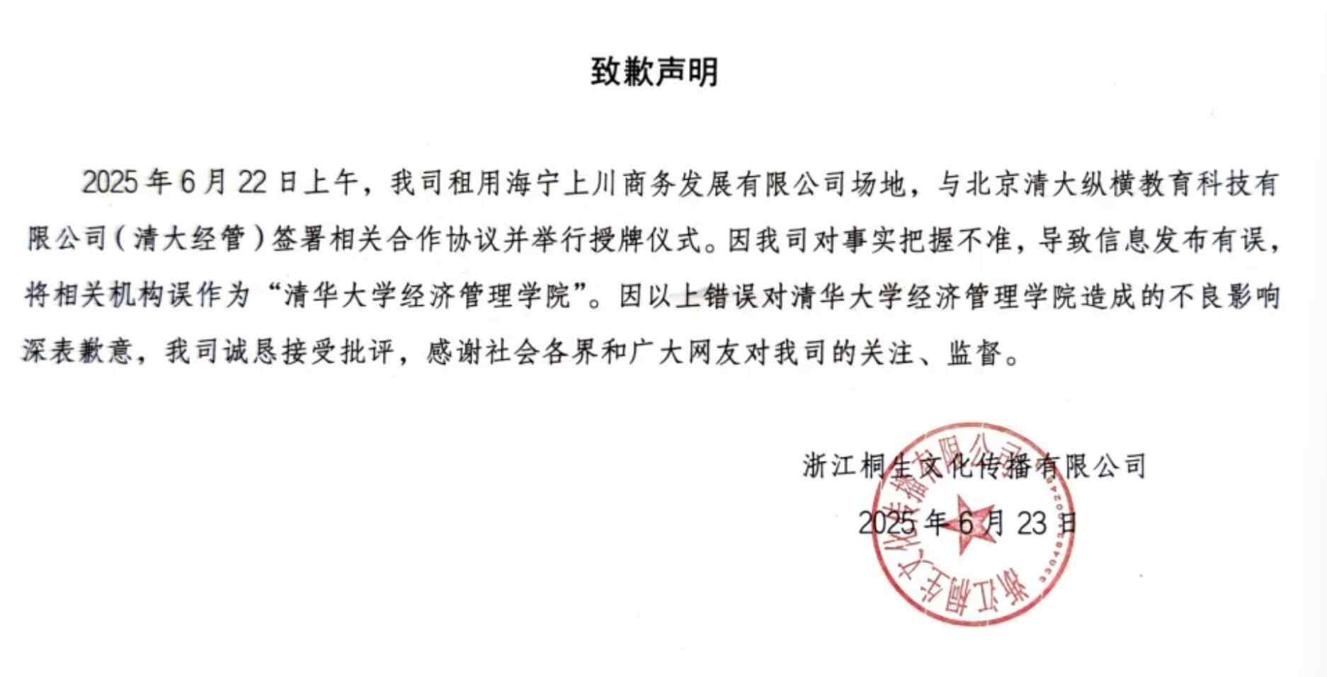 浙江桐生文化传播有限公司发文致歉。该公司表示,6月22日上午,该公司租用海宁上川商务发展有限公司场地,与北京清大纵横教育科技有限公司(清大经管)签署相关合作协议并举行授牌仪式。因该公司对事实把握不准,导致信息发布有误,将相关机构误作为“清华大学经济管理学院”。因以上错误对清华大学经济管理学院造成的不良影响深表歉意。