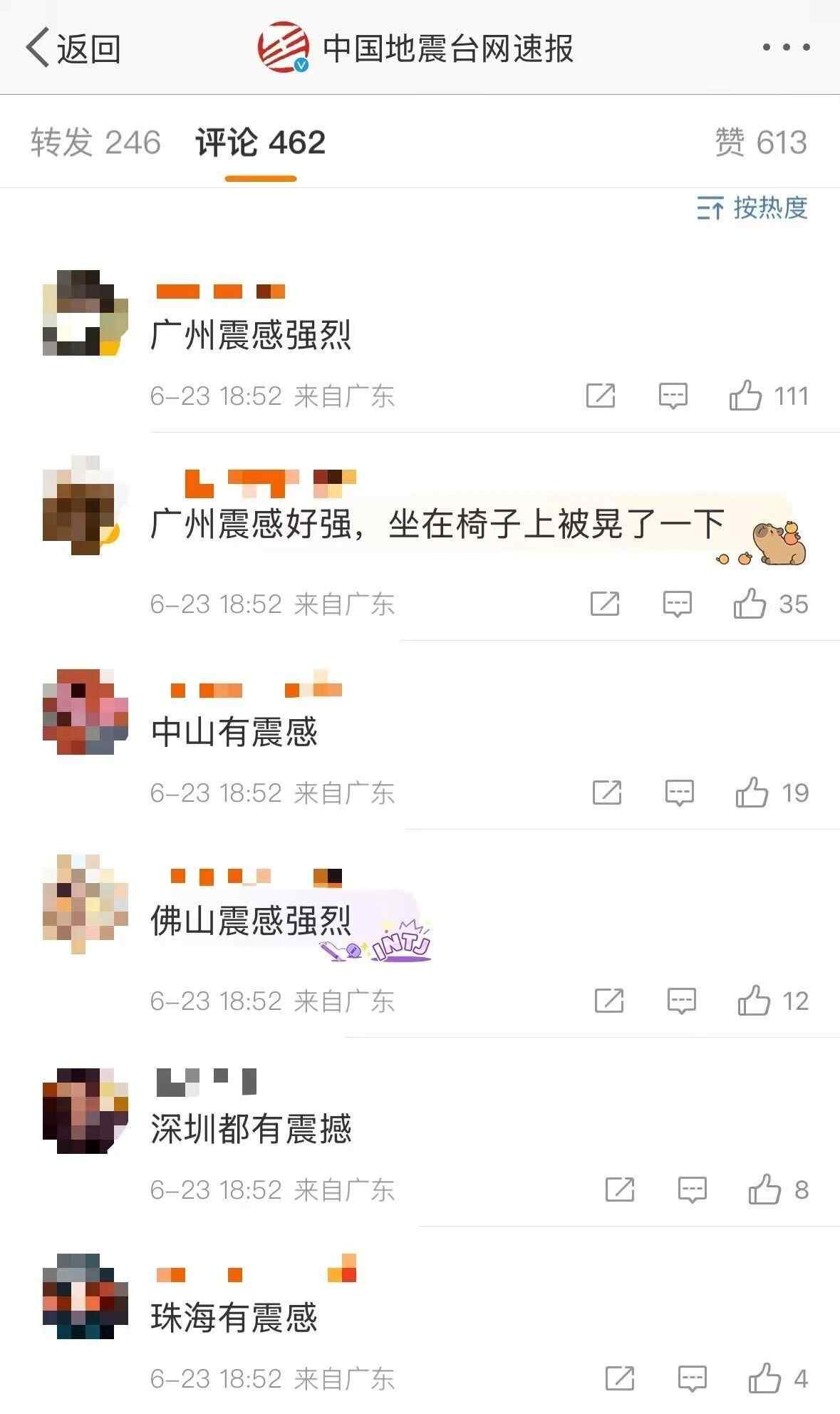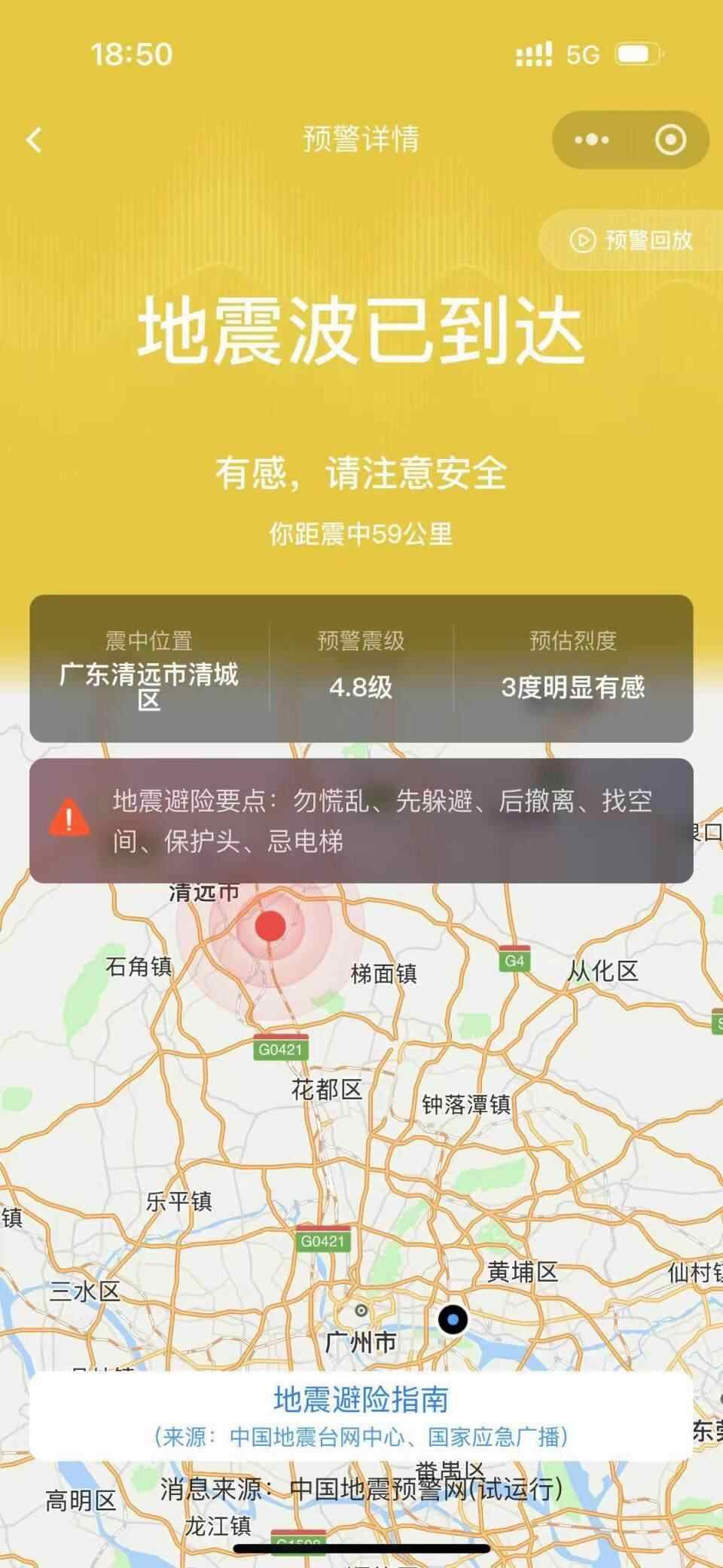 此次地震震中距广州市55公里。地震发生后,网友反映,广州、中山、佛山、深圳、珠海等地有震感。