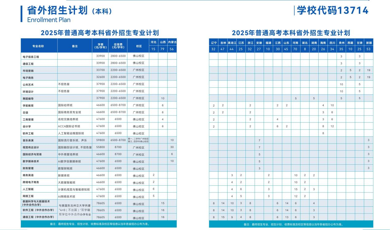 广州工商学院2025年招生计划近日公布,面向全国22个省级行政区计划招收全日制本科生7548人,专科生200人。学校在广东省录取批次为本科批次,专科批次。省外本科招生包括河北、山西、内蒙古、辽宁、黑龙江、江苏、浙江、安徽、湖南、海南、四川、贵州、西藏、甘肃、新疆、吉林、江西、山东、河南、湖北、福建,省外计划数共723人。