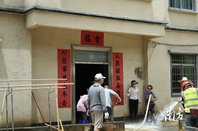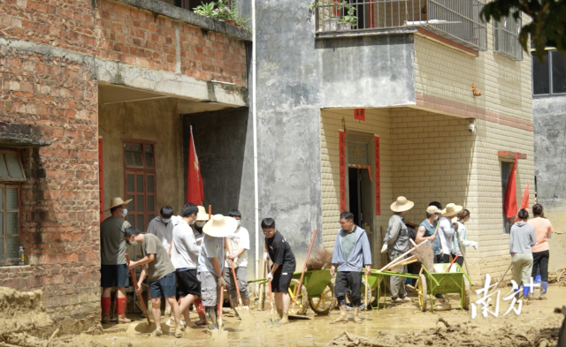 当天,在连续晴好天气和地质灾害专家确认山体稳定后,贵子镇党委吹响清淤复产“集结号”。鲜红党旗下,来自四面八方的党员干部、社工、志愿者及群众,与轰鸣的铲车、挖掘机汇聚一线,疏通沟渠、搬运瓦砾、清理庭院……