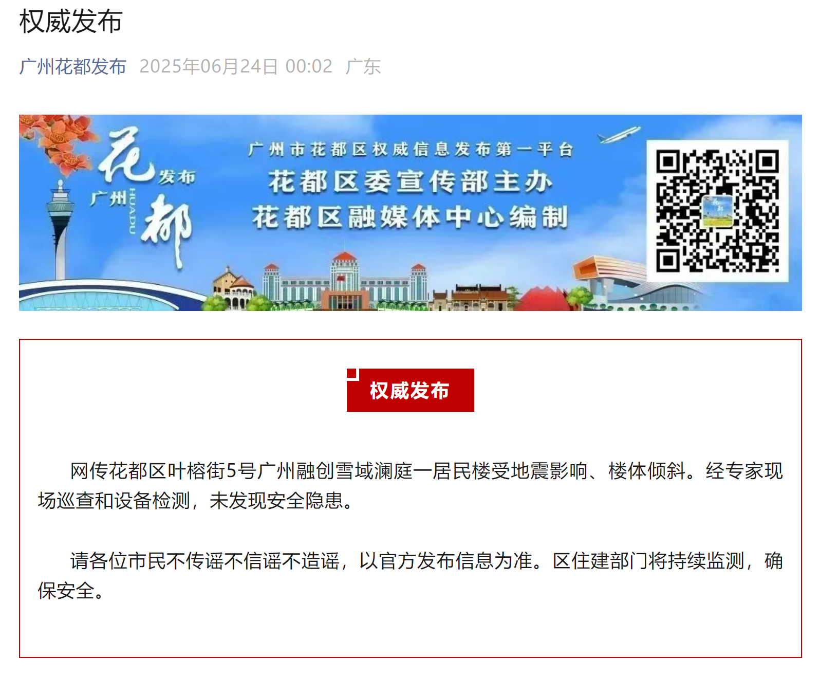 6月24日凌晨,广州花都发布发文表示:网传花都区叶榕街5号广州融创雪域澜庭一居民楼受地震影响、楼体倾斜。经专家现场巡查和设备检测,未发现安全隐患。