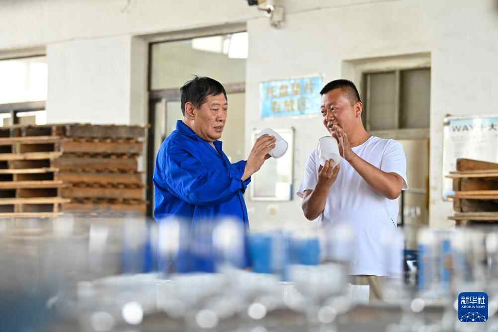 在山西省祁县山西大华玻璃实业有限公司,公司创始人闫保平(左)查看玻璃产品有无瑕疵(6月11日摄)。