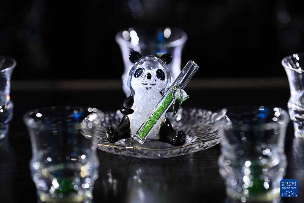 这是在位于山西省祁县的“一带一路”合作区规划展示馆拍摄的一款熊猫主题玻璃茶具(6月11日摄)。