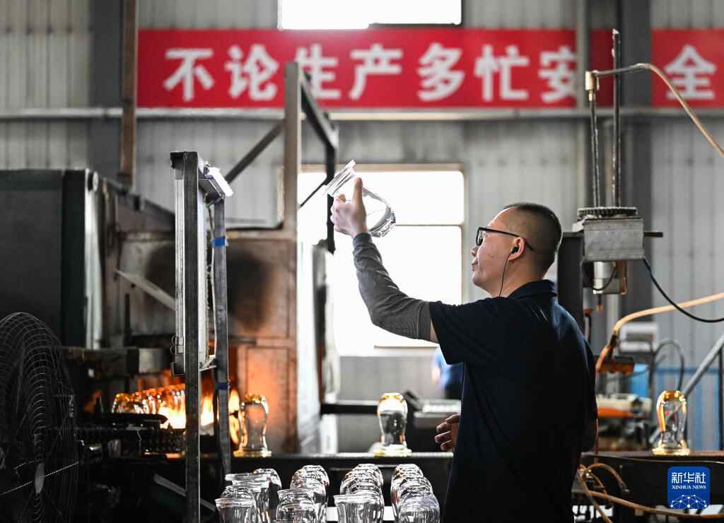 在山西省祁县山西宏艺玻璃器皿有限责任公司,一名工作人员查看玻璃产品是否有瑕疵(6月12日摄)。