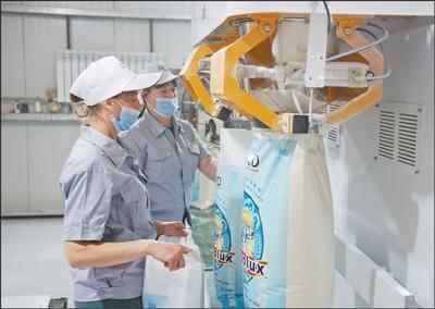 西安爱菊集团哈萨克斯坦园区二期厂房内,当地工人在面粉加工流水线上作业。