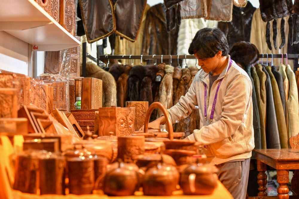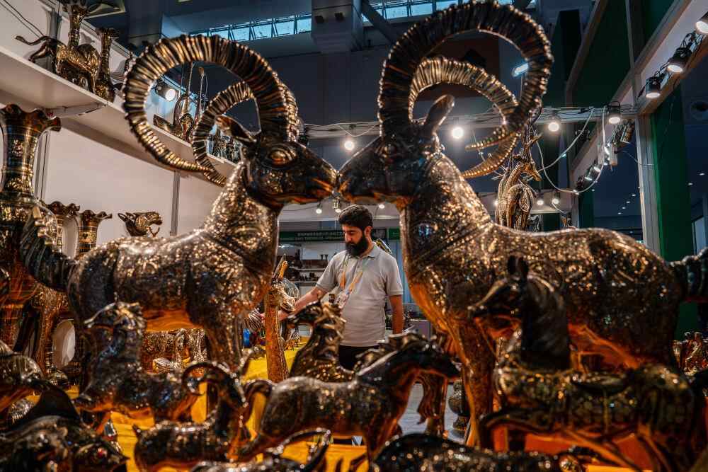 6月20日,顾客在南亚馆巴基斯坦展区选购铜制工艺品。