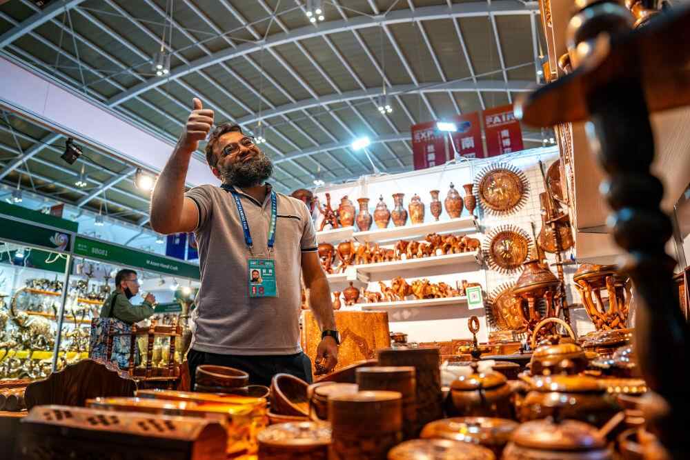 6月21日,一名南亚馆巴基斯坦展区的展商在摆放木制手工艺品。