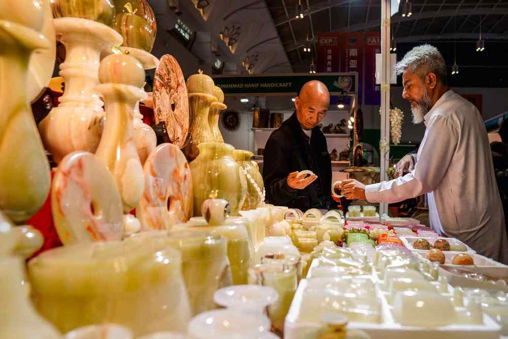 6月20日,顾客在南亚馆巴基斯坦展区选购玉石工艺品。