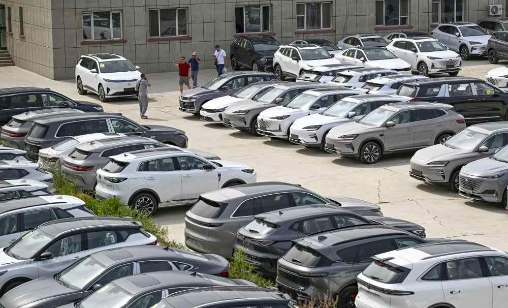 在新疆霍尔果斯一家汽车贸易公司,外国客商在室外仓库了解情况(6月10日摄)。新华社记者 陈朔 摄