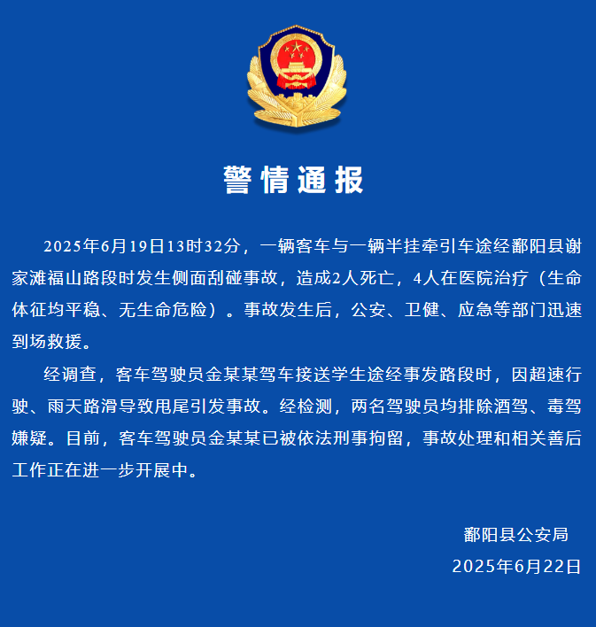 2025年6月19日13时32分,一辆客车与一辆半挂牵引车途经鄱阳县谢家滩福山路段时发生侧面刮碰事故,造成2人死亡,4人在医院治疗(生命体征均平稳、无生命危险)。事故发生后,公安、卫健、应急等部门迅速到场救援。