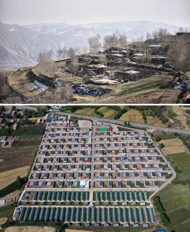 上图为2016年11月拍摄的脱贫前的青海互助土族自治县班彦村村貌,下图为2019年9月拍摄的青海互助土族自治县班彦新村村貌。