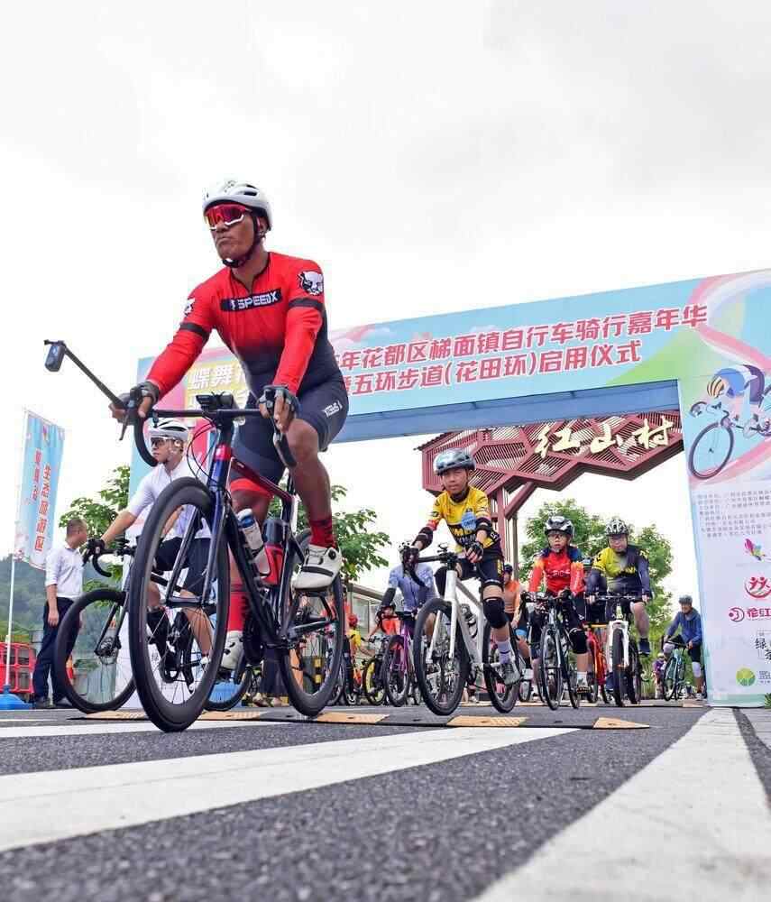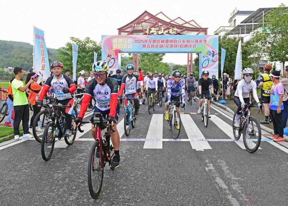 随着一声清脆的鸣笛划破山间的宁静,在梯面镇领导的带领下,500多名身着缤纷骑行服的骑手如离弦之箭,从红山村起点飞驰而出,正式踏上全新启用的五环步道核心环线——“花田环”。据介绍,本次骑行路线全长约70公里,精心串联起花田环、青山环等五环步道特色路段,并途经红山村、一线天、五联水库等梯面知名景点。骑行者们穿梭于葱郁森林与潺潺溪流之间,深度体验“车在景中行,人在画中游”的生态骑行魅力,尽享夏日激情。
