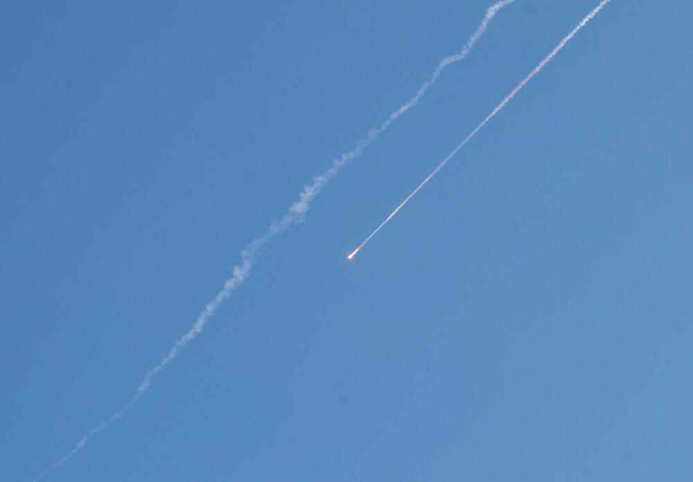 这是6月22日在耶路撒冷上空拍摄到的导弹痕迹。新华社记者陈君清摄
