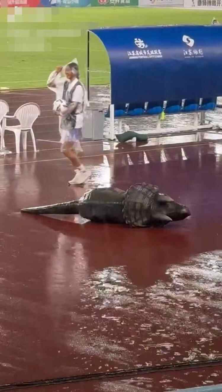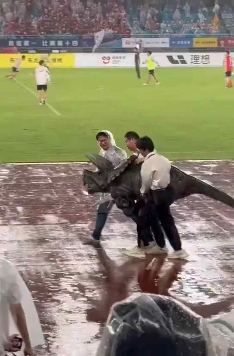 6月21日,在常州队0∶4不敌南京队的“苏超”联赛(江苏省城市足球联赛)赛后,多名现场球迷拍到了一段视频:在场上为常州队加油助威的一只小恐龙倒在了场地边,被工作人员抬走。
