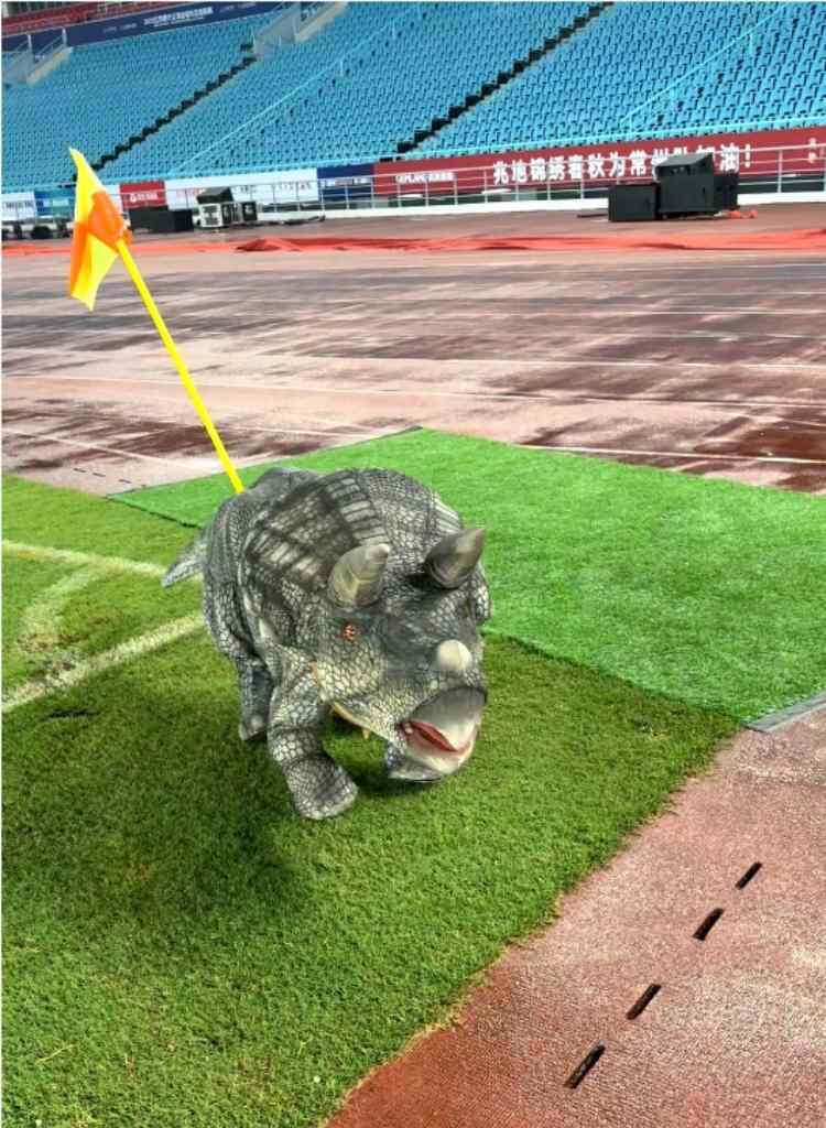 有网友调侃:“常州0∶4输给了南京,气死了一头恐龙!”也有网友担心恐龙是演员穿皮套扮演的,晕倒后可能会有危险。