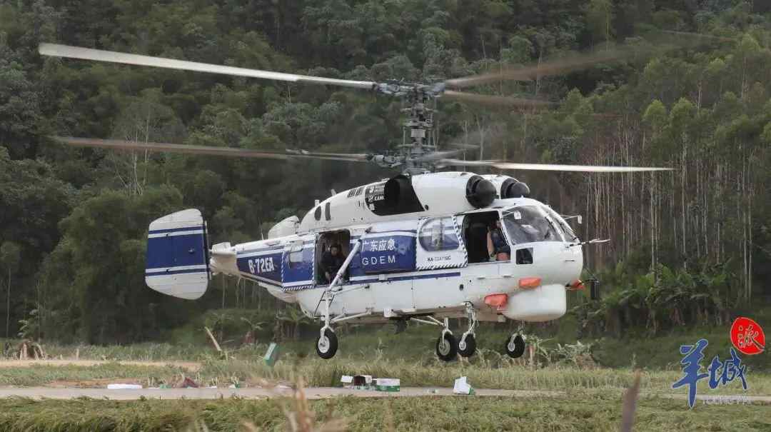 20日下午4点半左右,广东应急直升机搭乘着满满的物资抵达蓝坑村上空。一箱箱水、八宝粥、被子等物资投向蓝坑村。救援队整理搬运物资后,村干部按照户数有序将物资发放给了村民。