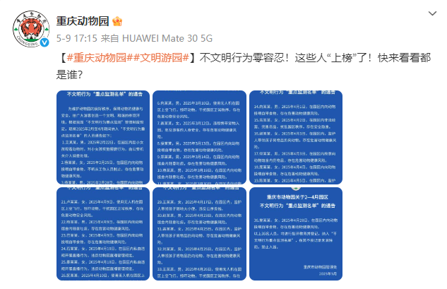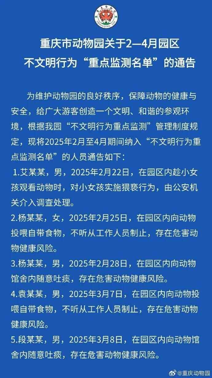今年5月9日,重庆动物园发布通告称,根据“不文明行为重点监测”管理制度规定,公布2025年2月至4月期间纳入“不文明行为重点监测名单”的人员,共有36名人员被纳入名单,在其不良记录未消除前,禁止入园。