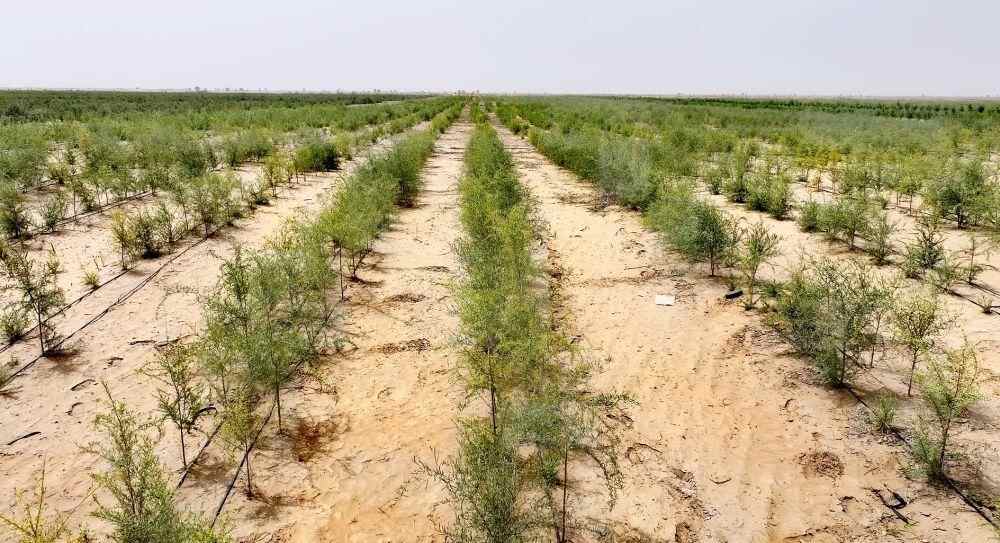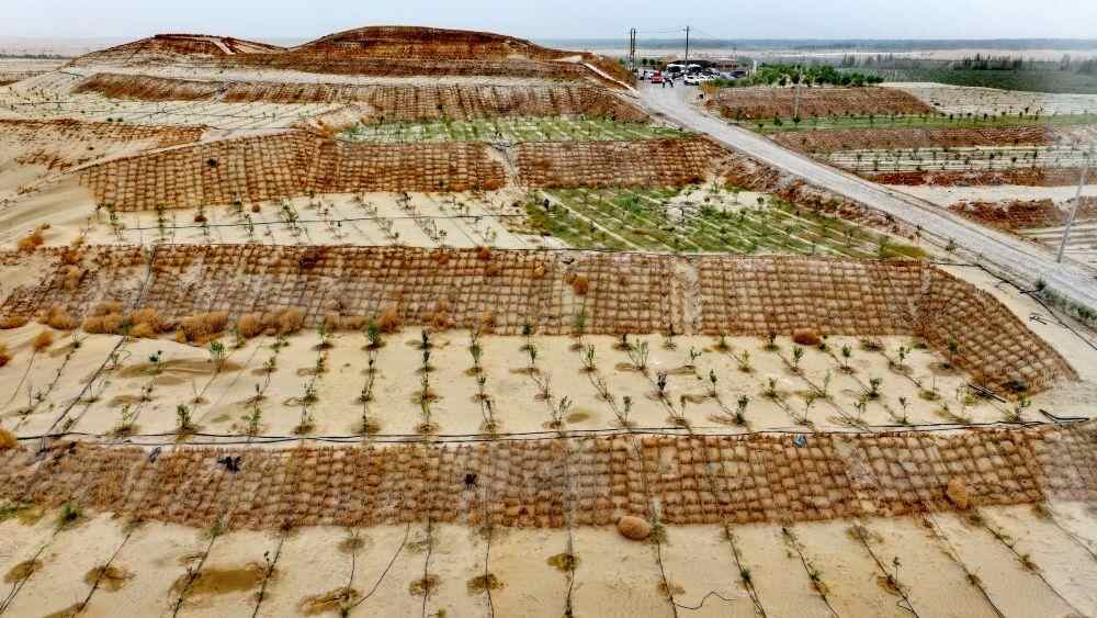 位于塔克拉玛干沙漠南缘的新疆于田县肩负着76公里沙漠锁边重任,曾饱受风沙肆虐,深陷生态与发展的双重困境。如今,依托阗东、万花园、葡萄园、金胡杨、万药园、阿热勒乡七仙女六大防沙治沙标杆示范区,创新探索出“梯田式”治沙模式,走出一条生态与经济协同发展的新路径。