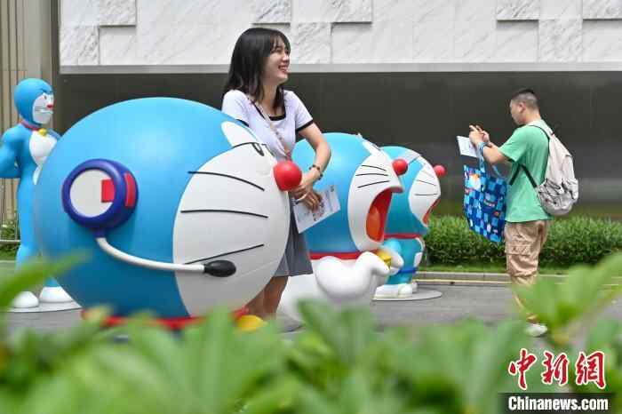 6月20日,“100%哆啦A梦&FRIENDS巡回特展”在广州K11购物艺术中心开展。图为游客与哆啦A梦卡通形象雕塑合影。中新社记者 陈骥旻 摄