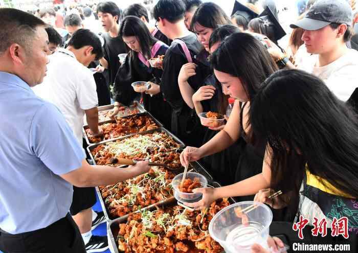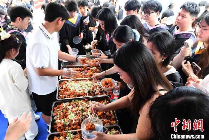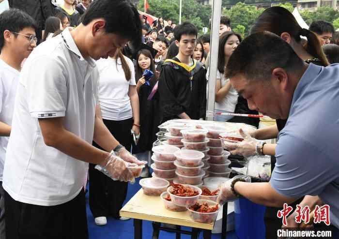 6月20日,重庆城市科技学院为毕业生精心筹备了一场别具特色的“鱼跃龙门宴”,提供两吨新鲜的鱼和小龙虾免费吃。据介绍,此次盛宴是用白鲢、花鲢、草鱼等品种的1.2吨鱼,制作出冷吃鱼、麻辣鱼、椒盐鱼、糖醋鱼和0.8吨小龙虾制作的香辣小龙虾、辣卤小龙虾、蒜蓉小龙虾等不同口味的美食,供毕业生们尽情享用。据悉,这场“鱼跃龙门宴”寓意深刻,该学校以“鱼跃龙门”传统典故,祝愿广大毕业生在新的人生征程中,能够像跃过龙门的鲤鱼一般,拥有乘风破浪、勇毅前行的勇气和力量。图为毕业生等待领取美食。中新社记者 周毅 摄