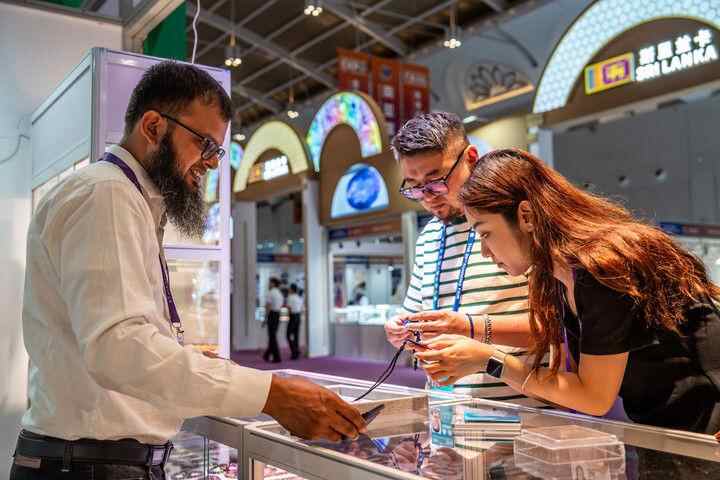 6月19日,观众在第9届中国—南亚博览会巴基斯坦展区选购特色商品。新华社记者胡超摄