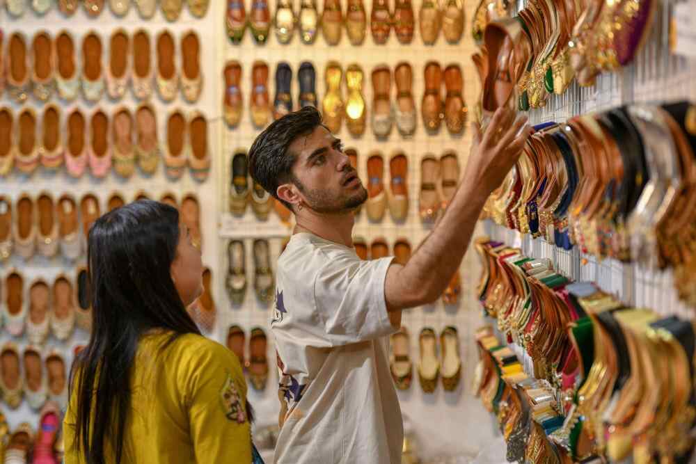 2025年6月19日,在第9届中国—南亚博览会,巴基斯坦展区的参展商(右)向一名顾客推介特色鞋。新华社发(彭奕凯 摄)