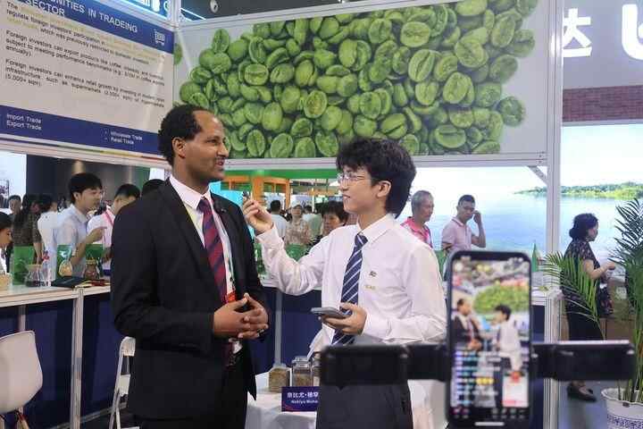 2025年6月14日,在第四届中国-非洲经贸博览会上,埃塞俄比亚驻华公使内比尤·穆罕穆德参加现场直播带货。新华社记者 周昊瑾 摄