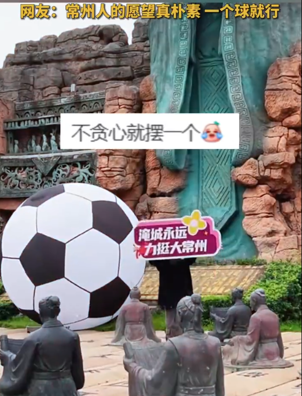 还有常州球迷在儒家文化地标孔子雕像前摆放一只足球,以极简方式应援“苏超”。