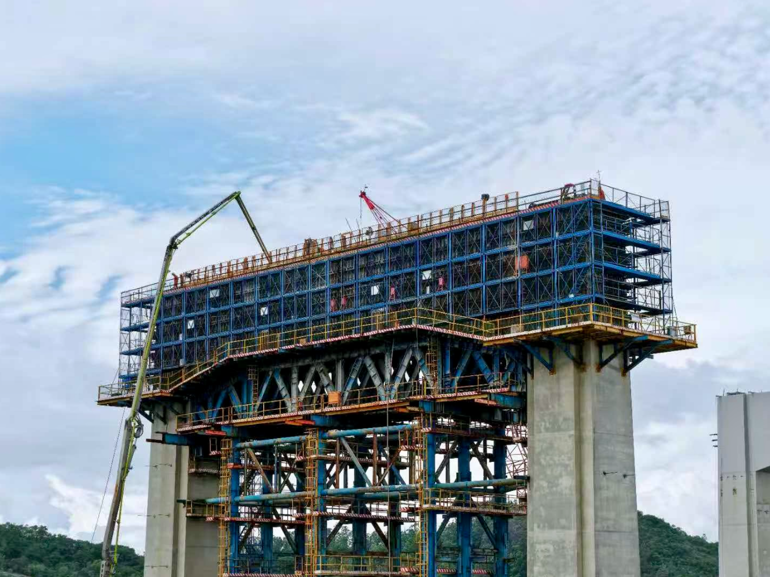 西高墩区引桥盖梁钢筋布置复杂,单片盖梁混凝土浇筑方量达1300多立方米,为此,项目团队采用BIM建模技术,开展碰撞模拟分析,提高施工质量及效率。针对大体积混凝土控裂难题,项目研发了全自动智能温控系统及可视化监测平台。下阶段,西高墩区引桥将进行顶推支架施工,为上部结构钢桁梁顶推施工做前期准备。