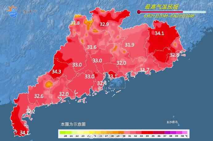 ◆22日,广东大部市县多云,局部有(雷)阵雨。最高气温普遍介于31~35℃之间。