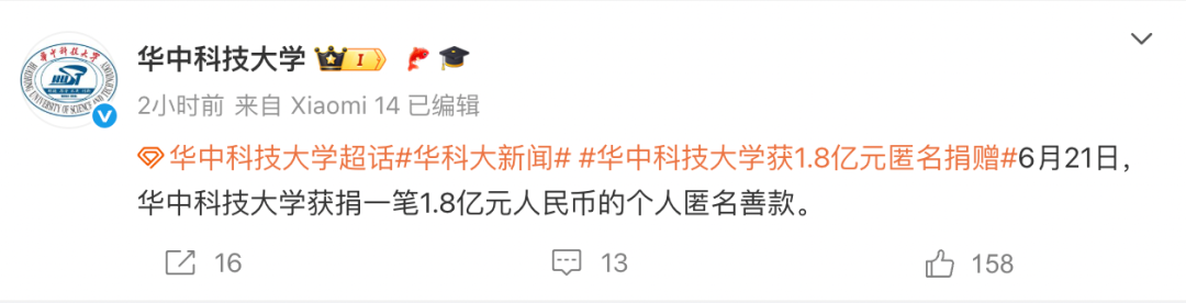 6月21日晚,华中科技大学官方发布消息:6月21日,华中科技大学获捐一笔1.8亿元人民币的个人匿名善款。