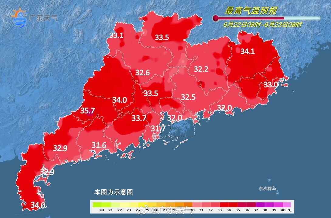 22日,广东省大部市县多云,局部有(雷)阵雨。最高气温普遍介于31~35℃之间。