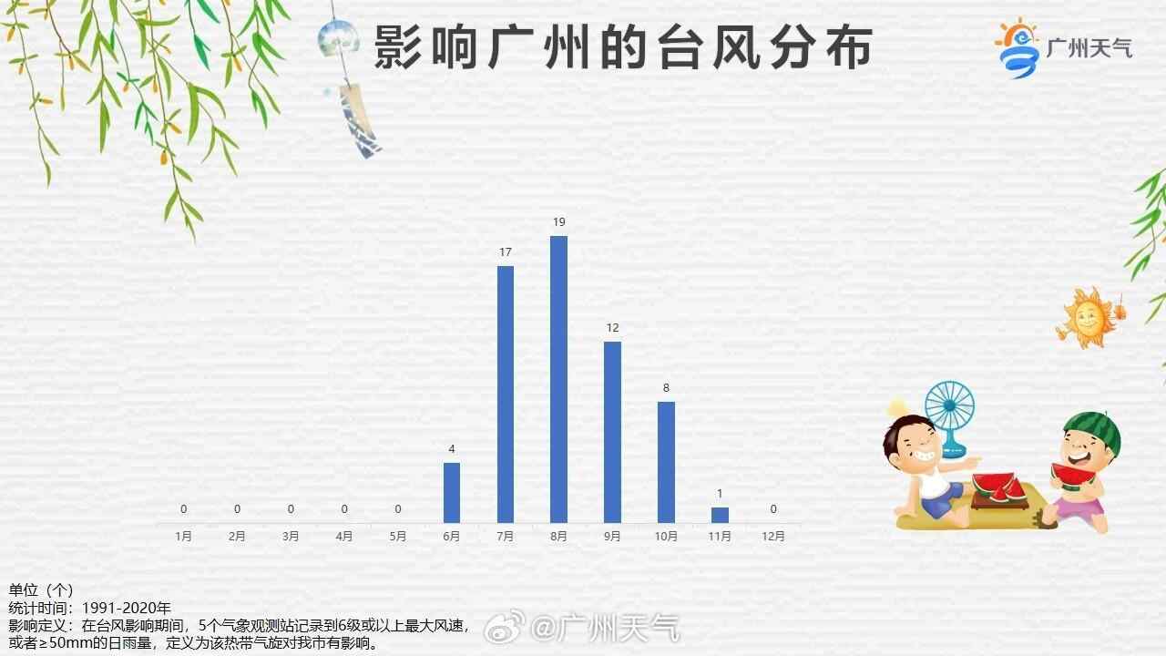 6月中下旬,台风也开始蠢蠢欲动,从常年(1991-2020)影响广州的台风分布图可以看出,广州受台风影响的时间段集中在6-11月,大家也要多留意最新的预报预警信息~