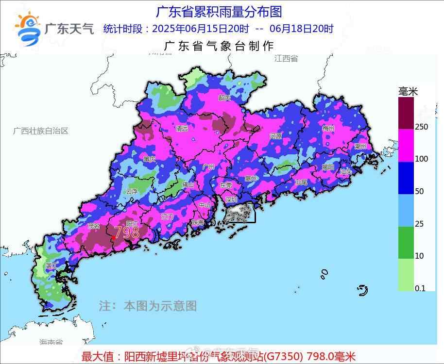 “龙舟水”期间全省平均降水量343.8毫米,较近30年同期(321.1毫米)偏多7%,比2024年(417.7毫米)偏少18%,共出现5次区域性暴雨过程(5月23-24日、5月29日、6月3日、6月12-15日,6月16-18日),呈现前少后多、西多东少的特点,6月中旬,受台风“蝴蝶”、季风等先后影响,广东出现了特强等级区域性暴雨过程,也是今年以来最强降水过程,其中阳西县程村镇录得最大1小时雨量142.6毫米,打破阳江市1小时雨量记录。
