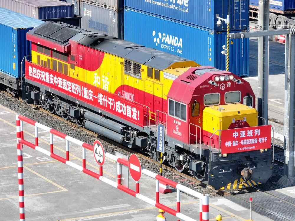 4月20日,图定中亚班列在重庆团结村中心站等候发车(无人机照片)。新华社记者 唐奕 摄