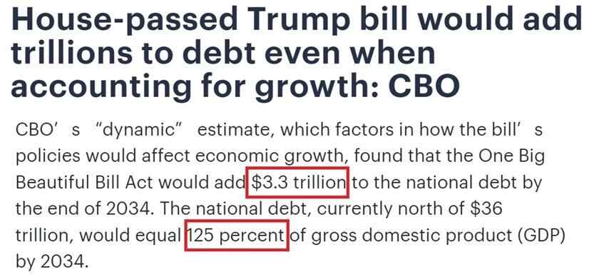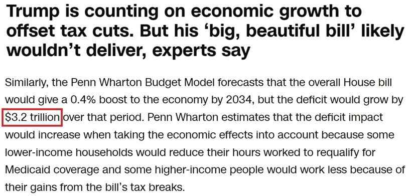 宾夕法尼亚大学沃顿商学院预算模型预测的数字更惊人:“大而美”法案一旦实施,到2034年(十年内)将使美国政府财政赤字增加3.2万亿美元。